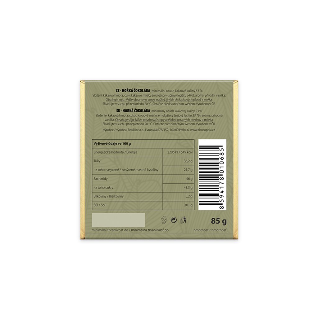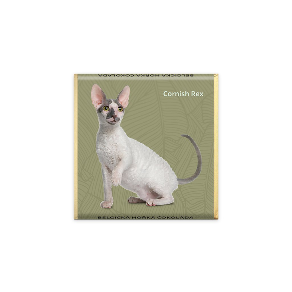 Kvalitní hořká čokoláda s motivem kočky cornish rex zaručeně udělá radost všem chovatelům a milovníkům koček. HOŘKÁ ČOKOLÁDA, minimální obsah kakaové sušiny 53 % Složení: kakaová hmota, cukr, kakaové máslo, emulgátory (sójový lecitin, E476), aroma: přírodní vanilka. Obsahuje sóju. Může obsahovat stopy arašídů, jiných skořápkových plodů a mléka. Výživové údaje ve 100 g výrobku Energetická hodnota2 296 kJ / 549 kcal Tuky- z toho nasycené mastné kyseliny36,2 g21,7 g Sacharidy- z toho cukry46 g43,3 g Bílkoviny5,2 g Sůl0,01 g Skladujte v suchu při teplotě do 20 °C. Chraňte před slunečním světlem.Vyrobeno v ČR, čokoládová hmota BARRY CALLEBAUT - Belgie.Doplňkové parametry
