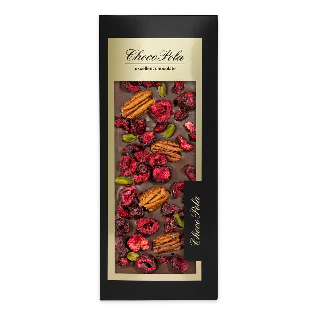 Hořká čokoláda 60%, višeň, pekanové ořechy, pistácie