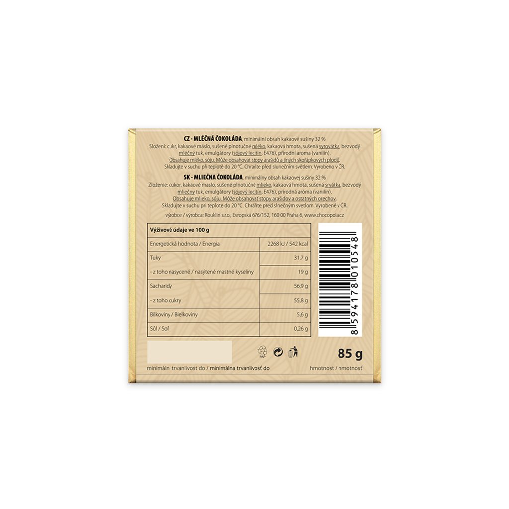 Kvalitní mléčná čokoláda s motivem německého trpasličího špice je oblíbeným dárkem. Tato malá čokoláda zaručeně udělá velkou radost každému chovateli psů nebo nadšenému pejskaři. MLÉČNÁ ČOKOLÁDA, minimální obsah kakaové sušiny 32 % Složení: cukr, kakaové máslo, sušené plnotučné mléko, kakaová hmota, sušená syrovátka, bezvodý mléčný tuk, emulgátory (sójový lecitin, E476), přírodní aroma (vanilín). Obsahuje mléko, sóju. Může obsahovat stopy arašídů a jiných skořápkových plodů. Výživové údaje ve 100 g výrobku Energetická hodnota2 268 kJ / 542 kcal Tuky- z toho nasycené mastné kyseliny31,7 g19 g Sacharidy- z toho cukry56,9 g55,8 g Bílkoviny5,6 g Sůl0,26 g Skladujte v suchu při teplotě do 20 °C. Chraňte před slunečním světlem. Vyrobeno v ČR, čokoládová hmota BARRY CALLEBAUT - Belgie.Doplňkové parametry