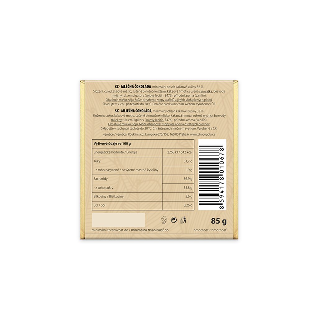 Kvalitní mléčná čokoláda s motivem orientální krátkosrsté kočky zaručeně udělá radost všem chovatelům a milovníkům koček. MLÉČNÁ ČOKOLÁDA, minimální obsah kakaové sušiny 32 % Složení: cukr, kakaové máslo, sušené plnotučné mléko, kakaová hmota, sušená syrovátka, bezvodý mléčný tuk, emulgátory (sójový lecitin, E476), přírodní aroma (vanilín). Obsahuje mléko, sóju. Může obsahovat stopy arašídů a jiných skořápkových plodů. Výživové údaje ve 100 g výrobku Energetická hodnota2 268 kJ / 542 kcal Tuky- z toho nasycené mastné kyseliny31,7 g19 g Sacharidy- z toho cukry56,9 g55,8 g Bílkoviny5,6 g Sůl0,26 g Skladujte v suchu při teplotě do 20 °C. Chraňte před slunečním světlem. Vyrobeno v ČR, čokoládová hmota BARRY CALLEBAUT - Belgie.Doplňkové parametry