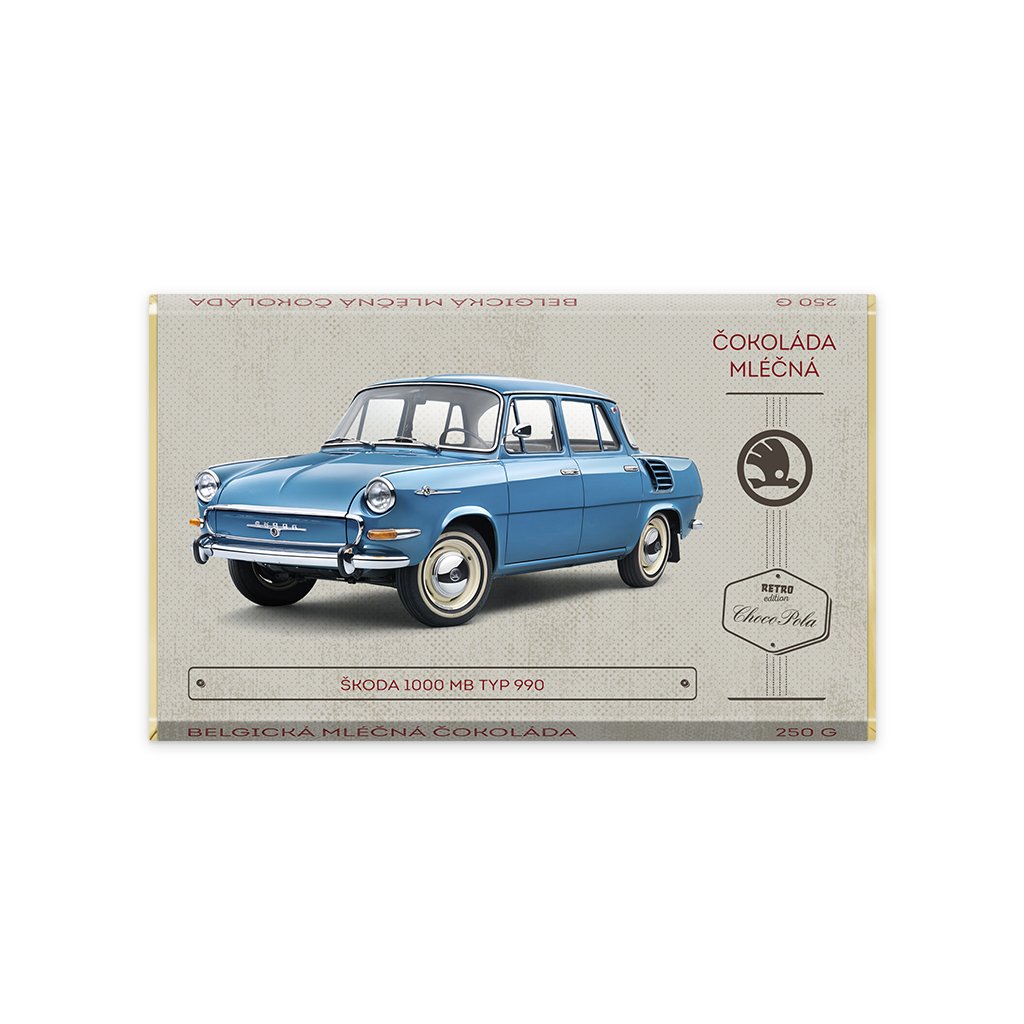 Mléčná čokoláda s motivem legendárního vozu Škoda 1000 MB udělá radost snad každému motoristovi. Embéčko je první československý automobil se samonosnou karosérií a zároveň první s koncepcí pohonu „vše vzadu“ (tedy motor vzadu a pohon zadní nápravy). Vyráběn byl v letech 1964–1969 a všech „tisícovek“ bylo vyrobeno cca 440 tis.